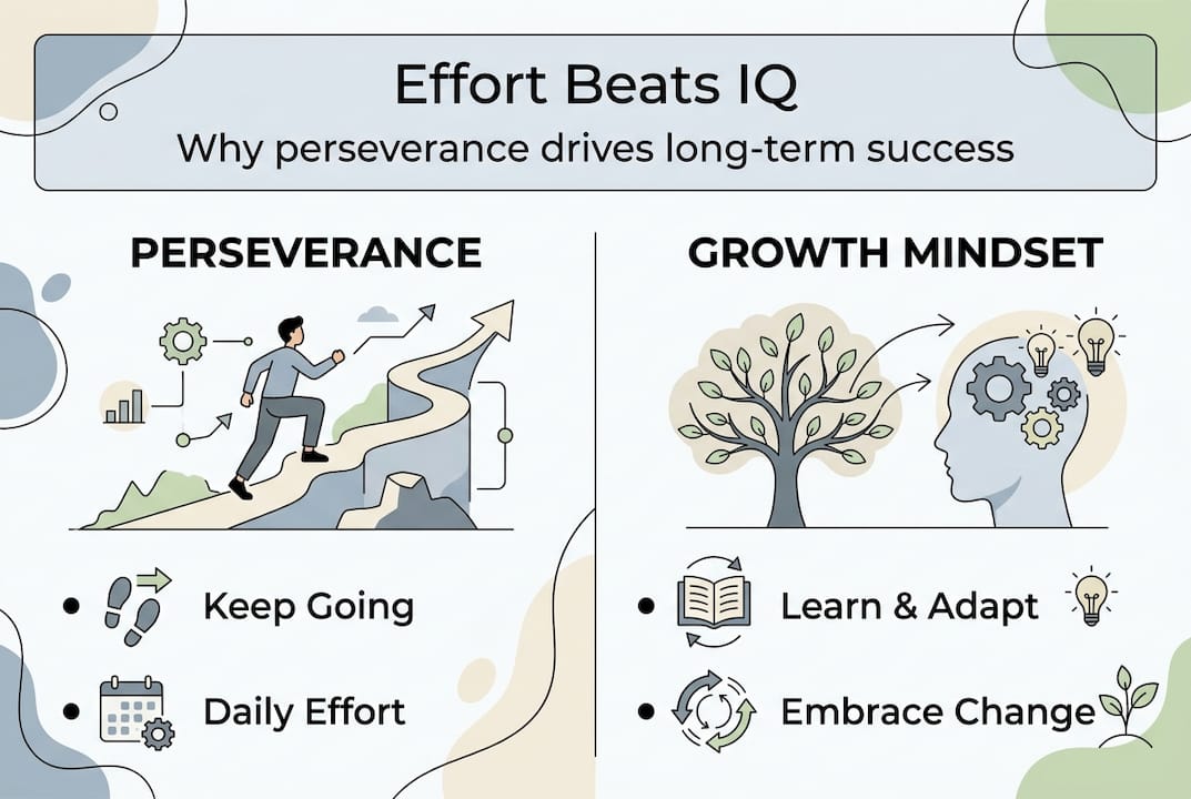 | Perseverance beats talent | Consistent effort is a stronger predictor of long-term success than natural aptitude. |